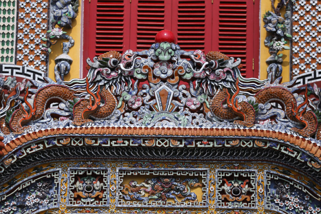 Unlike other buildings in Hue, the facade here is richly decorated with many porcelain and glass motifs. These details are highly elaborate and give the palace a more ornate and more Western feel than the other buildings in the citadel.