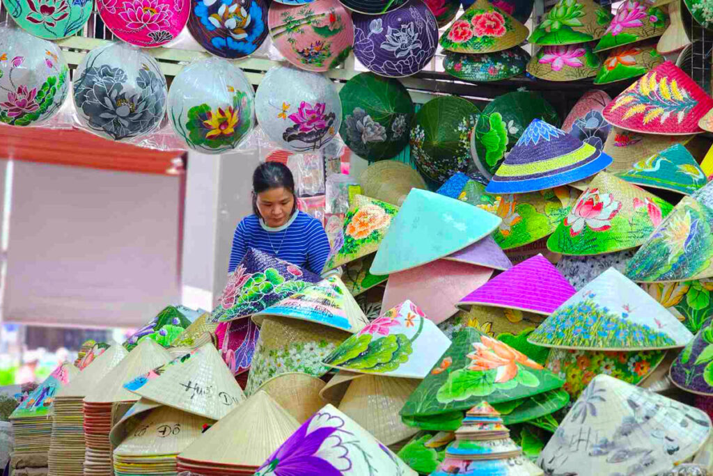 Le deuxième étage est davantage tourné vers les souvenirs et l’artisanat. On y trouve beaucoup d’objets typiques de Hué, comme les chapeaux coniques, des objets en bambou ou en rotin, de la céramique ou encore des petits souvenirs faciles à rapporter. C’est généralement l’endroit où les visiteurs s’arrêtent le plus longtemps.