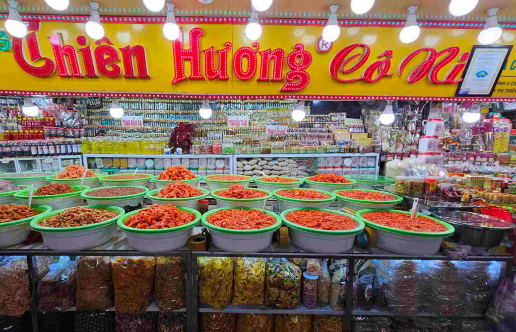 Le bâtiment principal couvre environ 15 000 m² et s’organise sur trois étages remplis de stands. L’ensemble est construit autour d’un grand bloc central avec des allées et des petites boutiques tout autour. Comme dans beaucoup de marchés vietnamiens, l’ambiance est animée. Les allées sont parfois étroites, les étals débordent de marchandises et les vendeurs interpellent les passants. On croise à la fois des habitants qui viennent faire leurs courses et des voyageurs curieux de découvrir l’endroit.